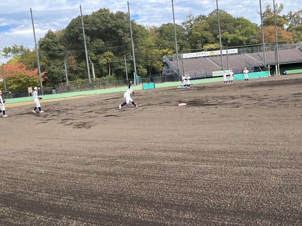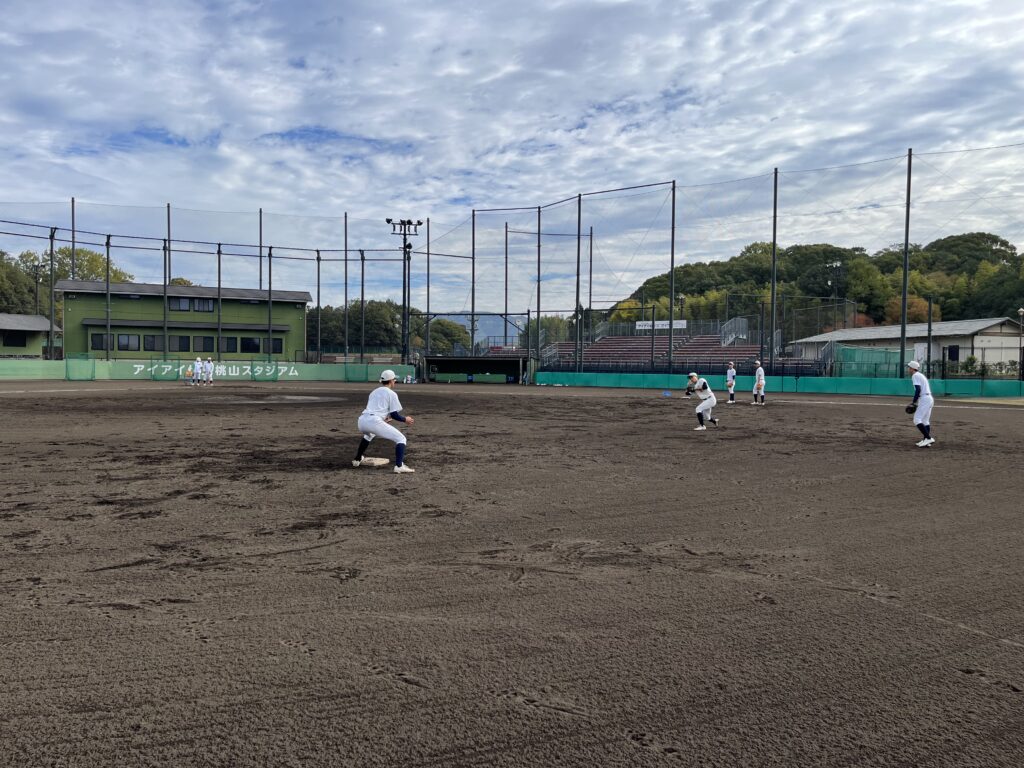 11月12日(水) 代休日のため、伏見桃山球場をお借りしての球場練習を行いました。普段大学グラウンドの練習では十分にできない内外連携プレーなどに時間をかけて取り組みました。
