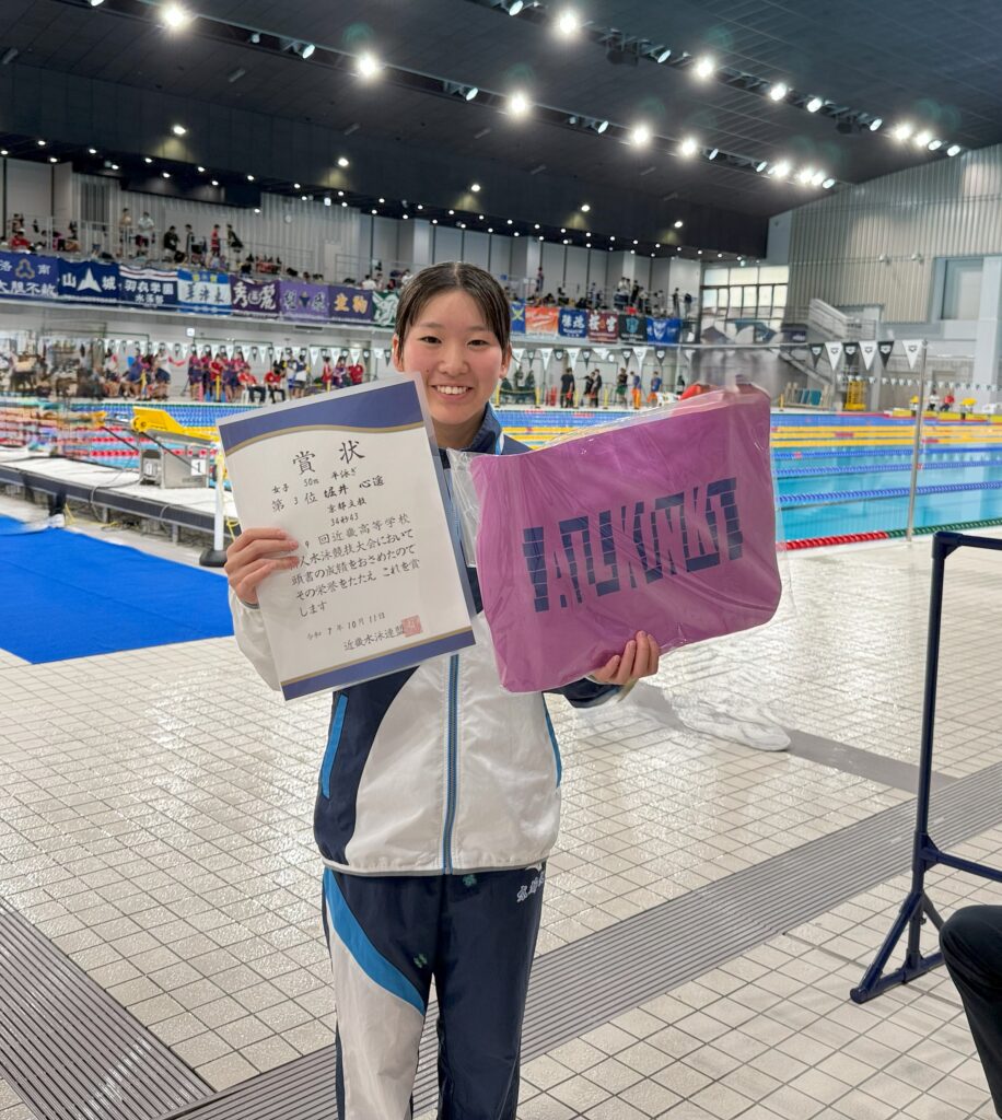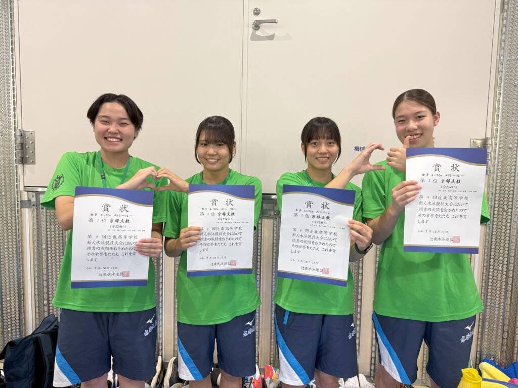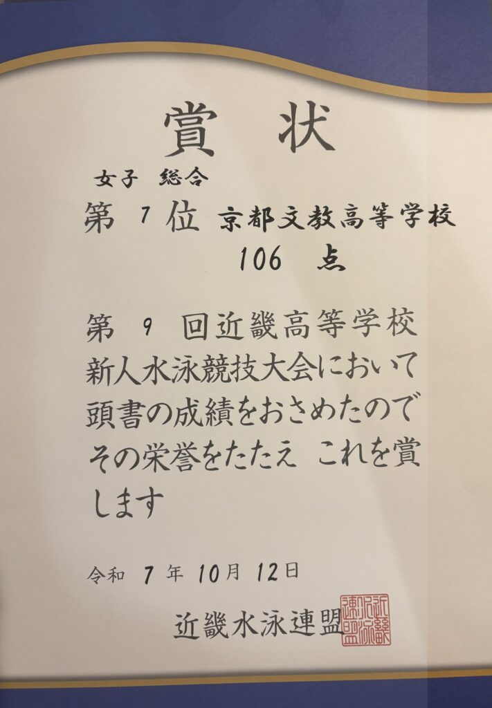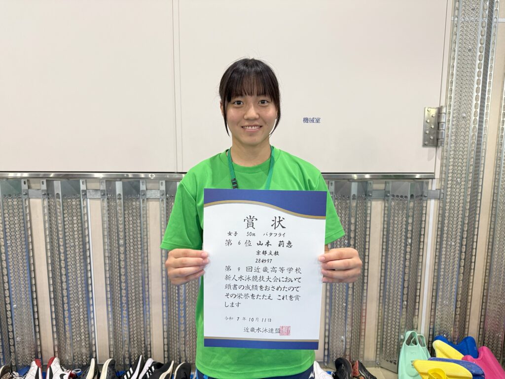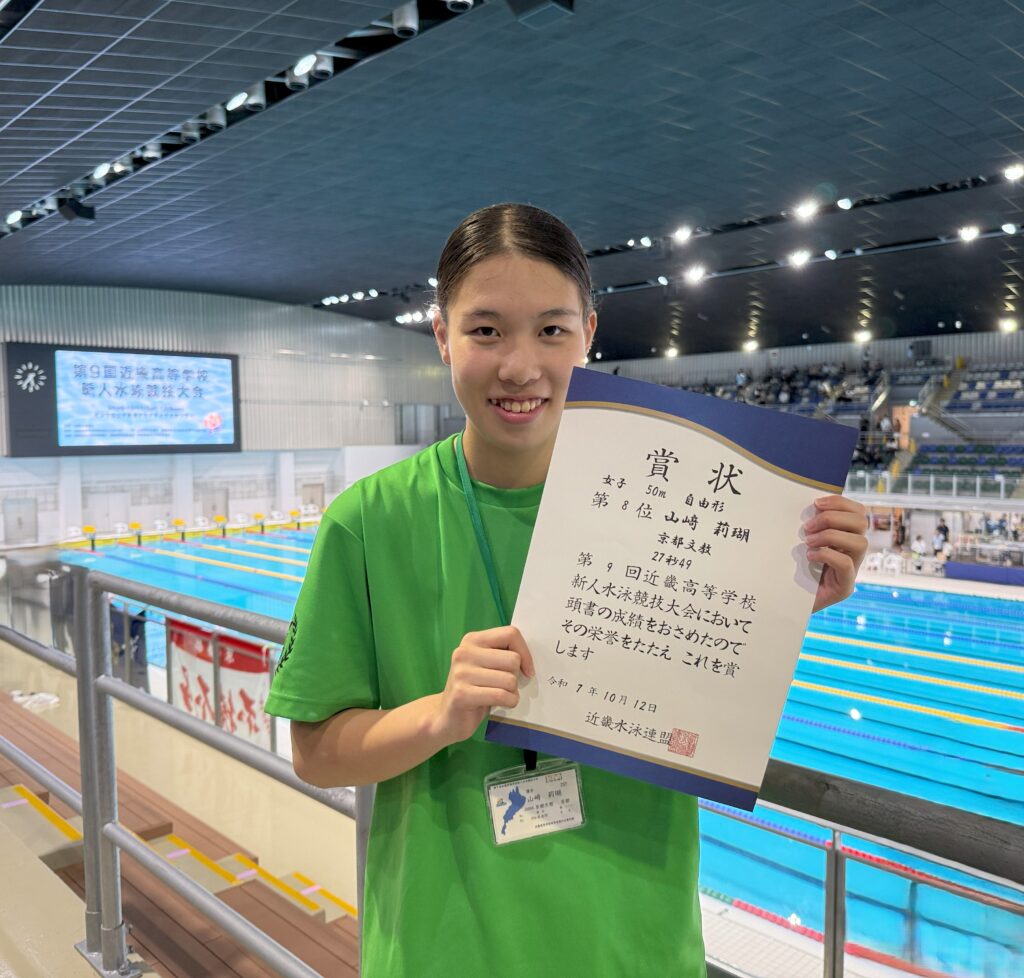 10/11(土),12(日)の2日間、第9回近畿高等学校水泳競技新人大会がインフロニア草津アクアティクスセンターで行われました。今大会は新チームになってから初めての近畿大会となります。結果としては近畿新人戦が始まってから初めて女子が総合で入賞することができました【総合第7位】。今できる最大限の力は発揮できたと思います。引き続き更なるレベルアップを図りたいと思います。以下が結果となります。たくさんのご声援ありがとうございました。
